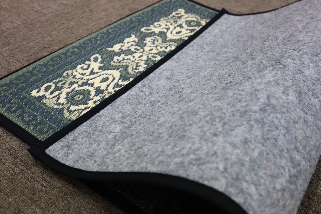 このい草玄関マットフォスは、福岡花ござの中でも特に繊細な文様がでる織り方で「三重織」と言います。良質ない草を使用し、三重織は経糸が多い特殊な製法の為、柄が細かく出せるので高級感があります。